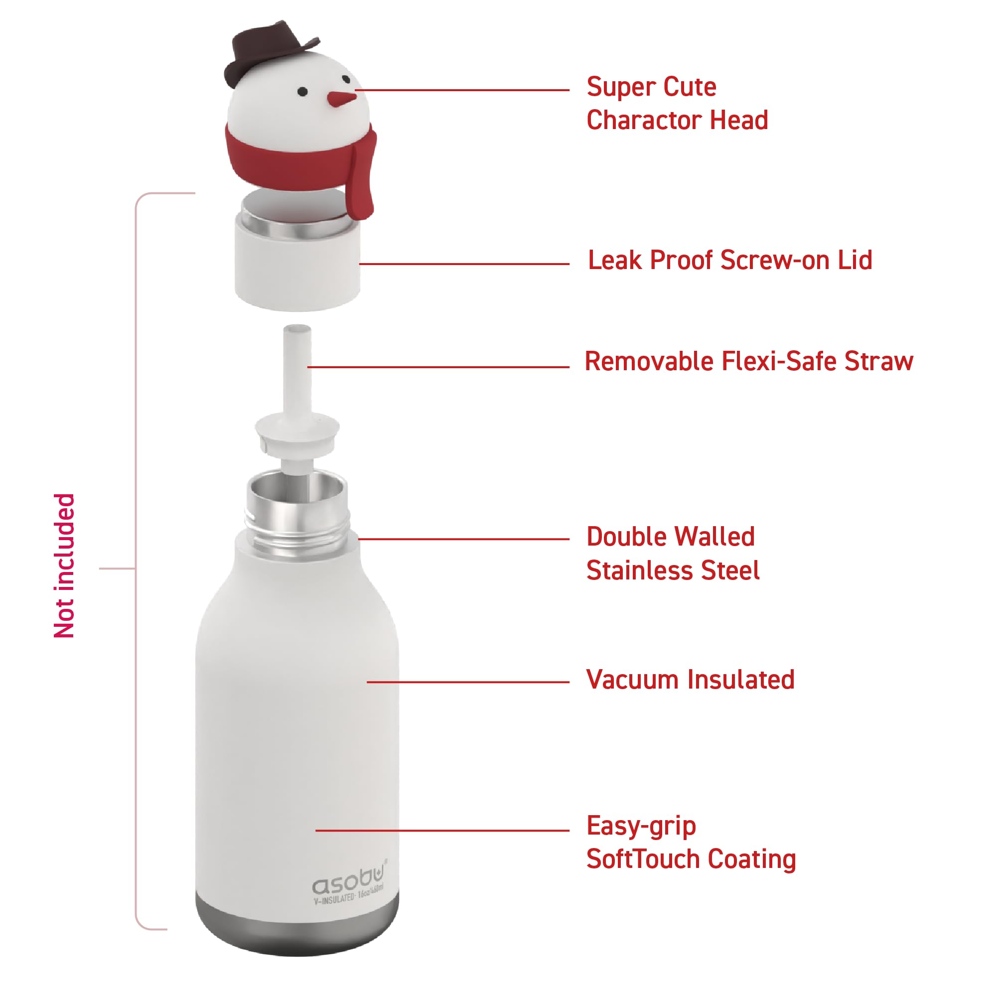 asobu Bestie Bottle Replacement Head For Insulated Stainless Steel Water Bottle, Detachable Soft Animal Head, Collectable Bottle Head for Fun Drinking For Kids, Snowman
