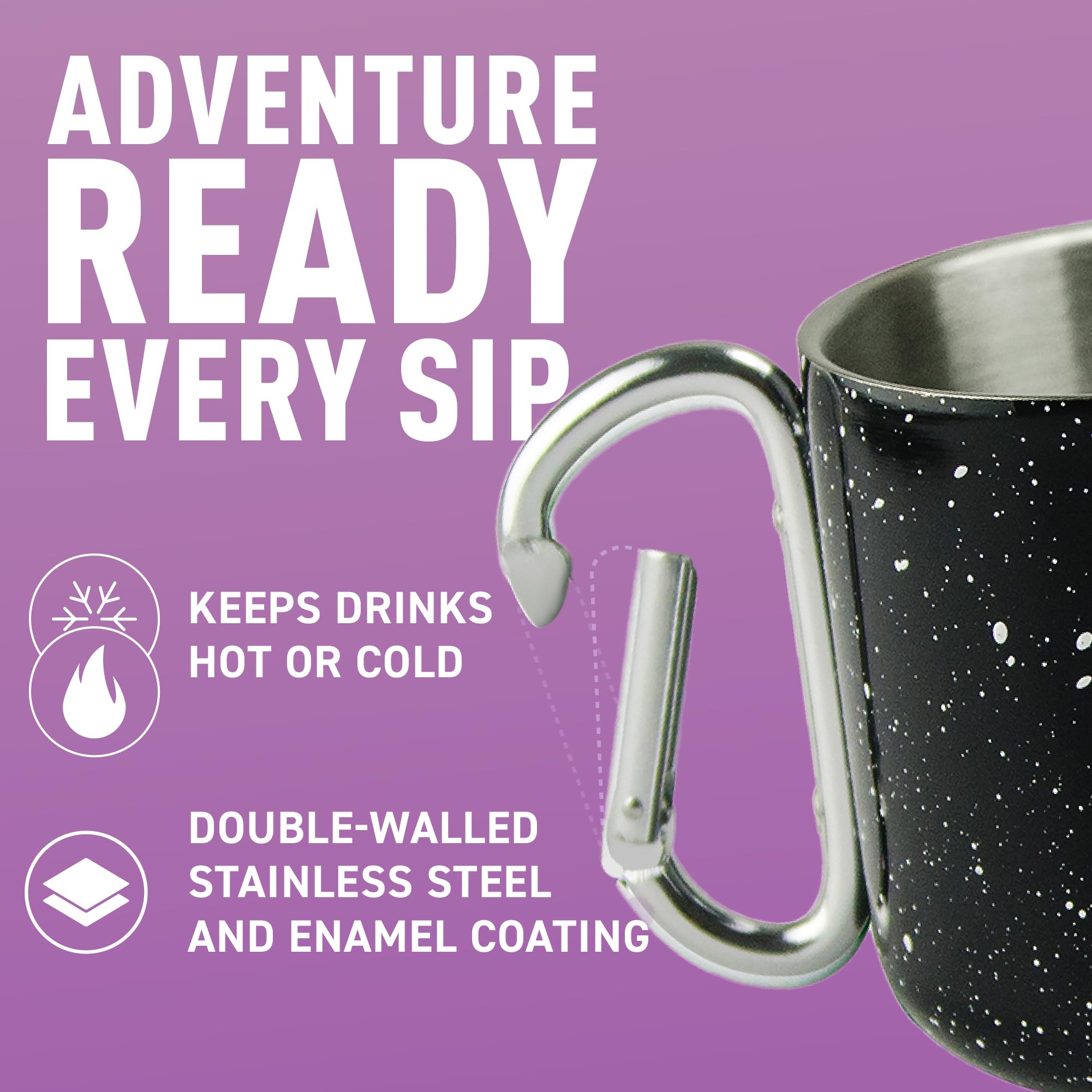 - Adventure-Ready and Built to Last: Whether hiking mountains, camping under the stars, or relaxing by the fire, our 12oz Campfire Mug is your ultimate companion. Its rugged stainless steel with enamel-coated finish ensures durability, while double-wall insulation keeps drinks hot or cold. The carabiner handle clips to your backpack, saving space for essentials.