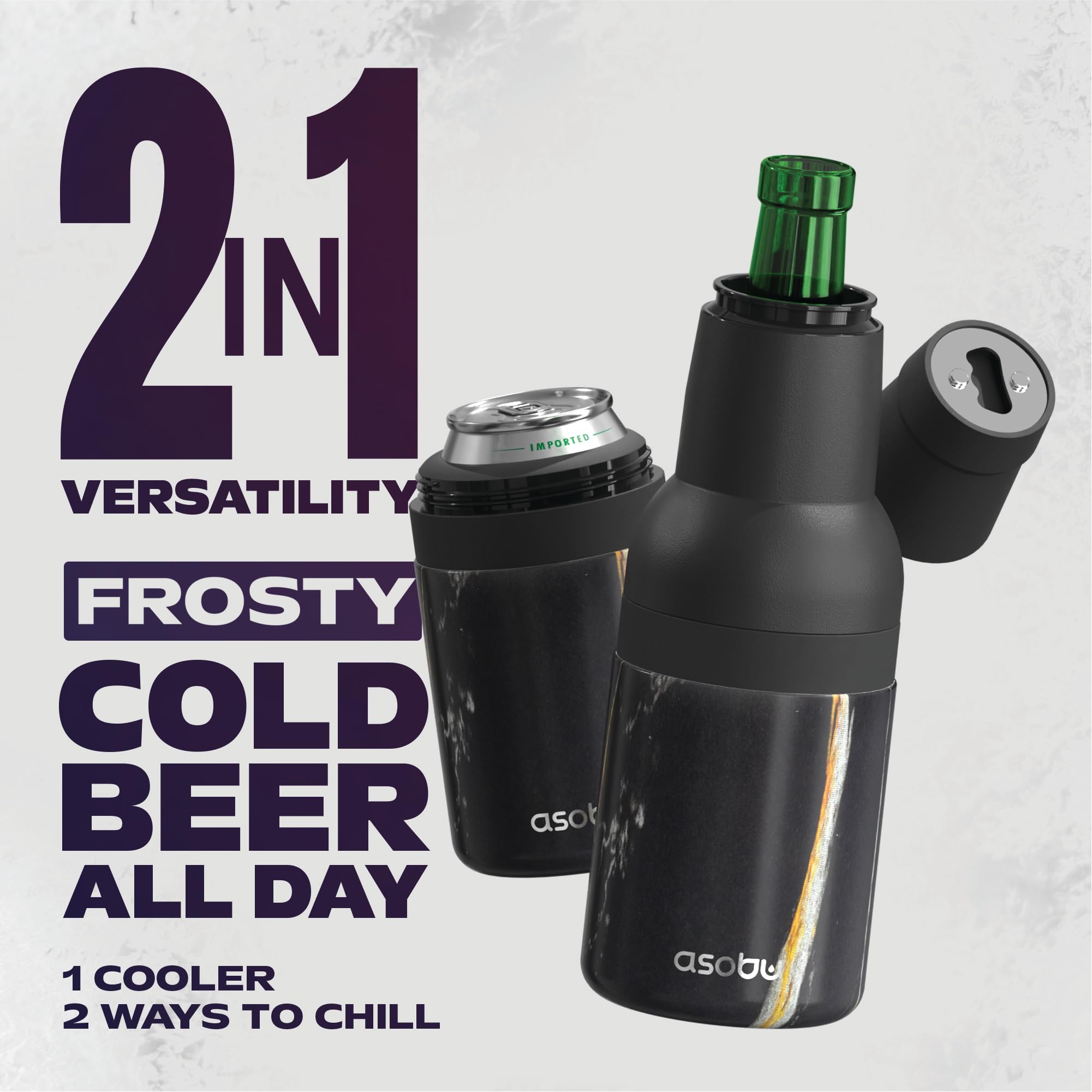 Asobu Frosty Beer Holder 2 Go Vacuum Insulated Double Walled Stainless Steel Beer Can and Bottle Cooler with Beer Opener, Bpa Free, Fits Standard 12oz Bottles, Gift for Beer Lovers (Midnight Marble)